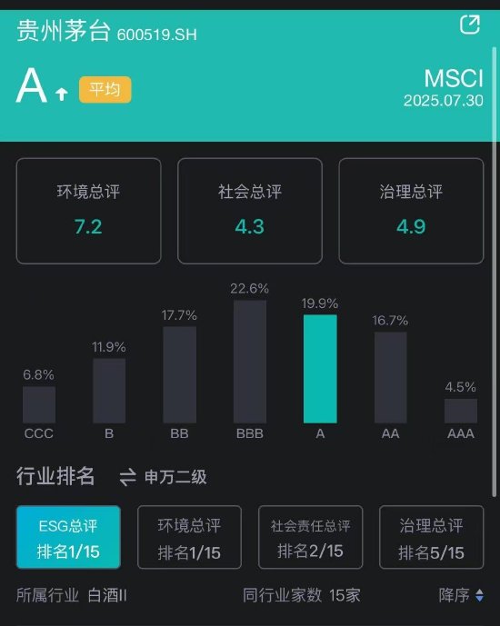 据新浪财经ESG评级中心显示,贵州茅台在MSCI的ESG评级已升为A级别,ESG总评排名白酒行业首位。其中,环境总评位列行业第1,社会责任总评均为行业第2,治理总评位列第5。